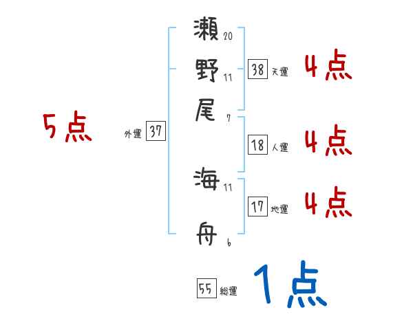 総運![]() | 瀬野尾海舟さんの総運は55画の1つ星!欲張りな性格で軽率な行動に注意しましょう。病気に気をつけて。 あなたの人生を表す1番重要な運勢です。生涯を通じて影響する総合運となり、主に50歳以降の晩年期に影響を及ぼします。 |