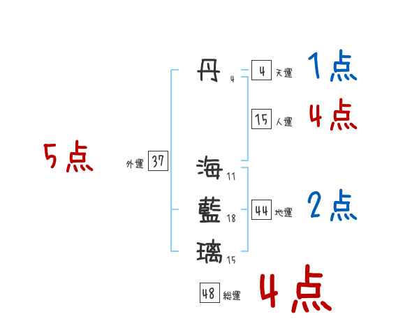 天運![]() | 丹海藍璃さんの天運は4画の1つ星!感情が不安定で苦労するかも。周囲との協調を心掛けましょう。 家系が持つ宿命的な運勢を表します。祖先から受け継いだ苗字ですので自分の力が及びません。家柄を象徴します。 |
