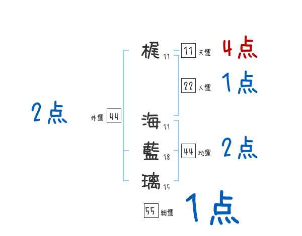 外運![]() | 梶海藍璃さんの外運は44画の2つ星!誠実で慎重な性格。物事を考えすぎないように注意しましょう。 生活面を象徴する運勢です。外部から受ける影響力を表し、結婚運、家庭運や職場、環境への順応性を表します。 |