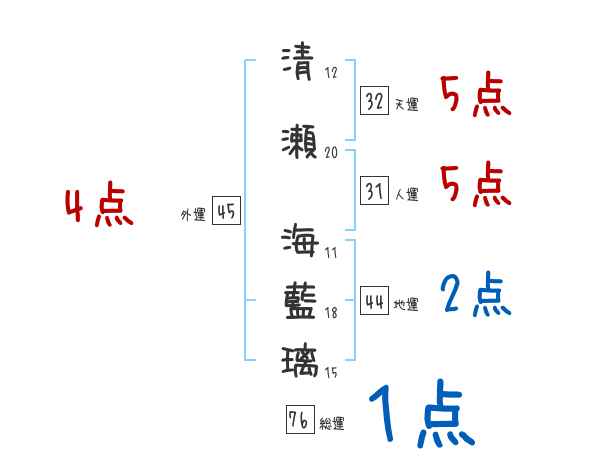 天運![]() | 清瀬海藍璃さんの天運は32画の5つ星!柔軟性があり成功する。チャンスが多く金運が良い。 家系が持つ宿命的な運勢を表します。祖先から受け継いだ苗字ですので自分の力が及びません。家柄を象徴します。 |