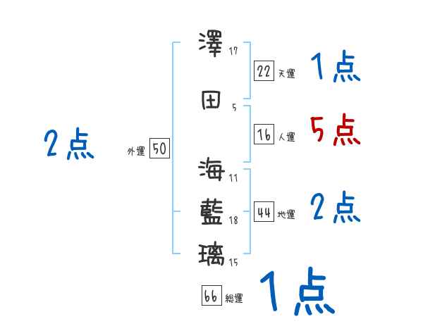 人運![]() | 澤田海藍璃さんの人運は16画の5つ星!人望が厚く大きく発展する。逆転成功が見える。 性格や才能などを表す2番目に重要な運勢です。人間関係や協調性、社会的な成功に影響します。主に20歳から50歳ぐらいまでの中年期の運勢を表します。 |