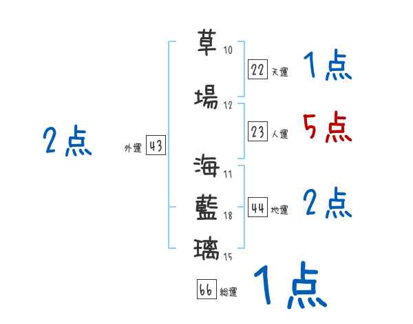 天運![]() | 草場海藍璃さんの天運は22画の1つ星!努力することが苦手ないっぽう手先が器用。芸術性にも優れる。 家系が持つ宿命的な運勢を表します。祖先から受け継いだ苗字ですので自分の力が及びません。家柄を象徴します。 |