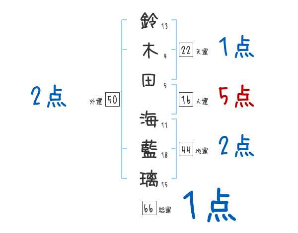 外運![]() | 鈴木田海藍璃さんの外運は50画の2つ星!浮き沈みが激しく不安定。しりすぼみに衰退しやすいので注意しましょう。 生活面を象徴する運勢です。外部から受ける影響力を表し、結婚運、家庭運や職場、環境への順応性を表します。 |
