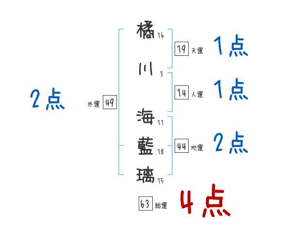 | 総運  | 橘川海藍璃さんの総運は63画の4つ星!家庭運がよく順調な生活。温和な性格。あなたの人生を表す1番重要な運勢です。生涯を通じて影響する総合運となり、主に50歳以降の晩年期に影響を及ぼします。 |