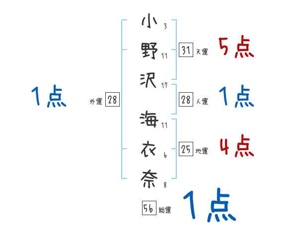 外運![]() | 小野沢海衣奈さんの外運は28画の1つ星!家庭環境に注意。スポーツで活躍できる能力があるかも。 生活面を象徴する運勢です。外部から受ける影響力を表し、結婚運、家庭運や職場、環境への順応性を表します。 |