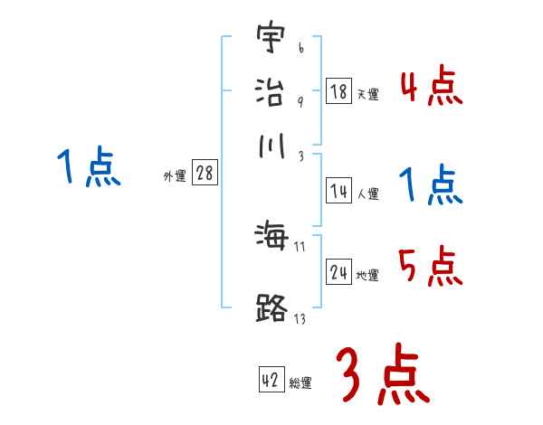 天運![]() | 宇治川海路さんの天運は18画の4つ星!情熱的で剛気。忍耐力があり信頼される。 家系が持つ宿命的な運勢を表します。祖先から受け継いだ苗字ですので自分の力が及びません。家柄を象徴します。 |