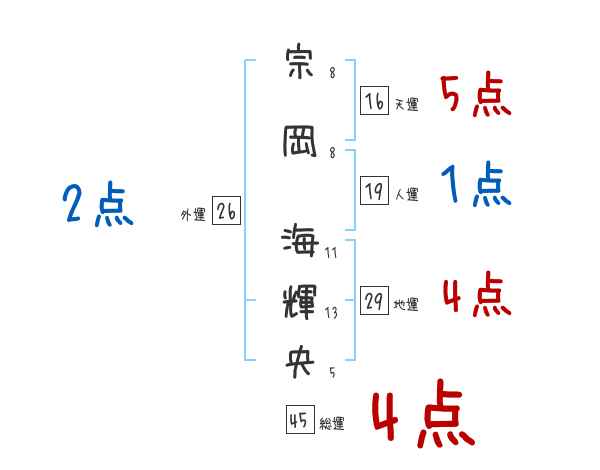 外運![]() | 宗岡海輝央さんの外運は26画の2つ星!波瀾万丈かも。信頼できる人を大事にしましょう。 生活面を象徴する運勢です。外部から受ける影響力を表し、結婚運、家庭運や職場、環境への順応性を表します。 |