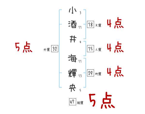 外運![]() | 小酒井海輝央さんの外運は32画の5つ星!柔軟性があり成功する。チャンスが多く金運が良い。 生活面を象徴する運勢です。外部から受ける影響力を表し、結婚運、家庭運や職場、環境への順応性を表します。 |