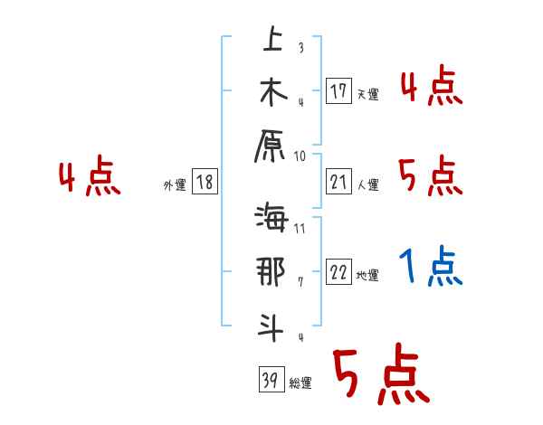総運![]() | 上木原海那斗さんの総運は39画の5つ星!社交性に優れ人望が厚い。人の上に立ち成功する。 あなたの人生を表す1番重要な運勢です。生涯を通じて影響する総合運となり、主に50歳以降の晩年期に影響を及ぼします。 |