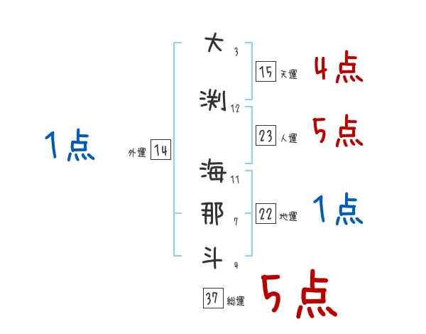 人運![]() | 大渕海那斗さんの人運は23画の5つ星!想像力に優れ活力がある。一代で成功し名誉を手に入れる。 性格や才能などを表す2番目に重要な運勢です。人間関係や協調性、社会的な成功に影響します。主に20歳から50歳ぐらいまでの中年期の運勢を表します。 |