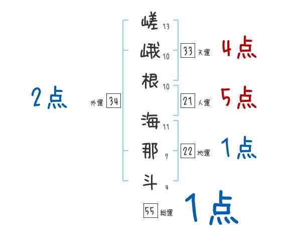 天運![]() | 嵯峨根海那斗さんの天運は33画の4つ星!権力志向でプライドが高い。勇気があり運を切り開き成功する。 家系が持つ宿命的な運勢を表します。祖先から受け継いだ苗字ですので自分の力が及びません。家柄を象徴します。 |