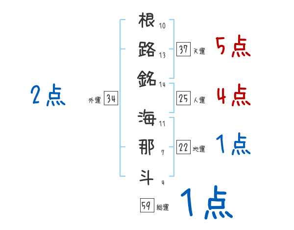 総運![]() | 根路銘海那斗さんの総運は59画の1つ星!意志の弱さであきらめることが多いかも。粘り強さが必要。 あなたの人生を表す1番重要な運勢です。生涯を通じて影響する総合運となり、主に50歳以降の晩年期に影響を及ぼします。 |