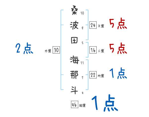 天運![]() | 桑波田海那斗さんの天運は24画の5つ星!家庭運が良く順調な人生。金運にも恵まれる。 家系が持つ宿命的な運勢を表します。祖先から受け継いだ苗字ですので自分の力が及びません。家柄を象徴します。 |