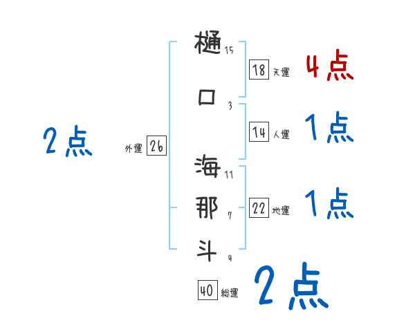 天運![]() | 樋口海那斗さんの天運は18画の4つ星!情熱的で剛気。忍耐力があり信頼される。 家系が持つ宿命的な運勢を表します。祖先から受け継いだ苗字ですので自分の力が及びません。家柄を象徴します。 |