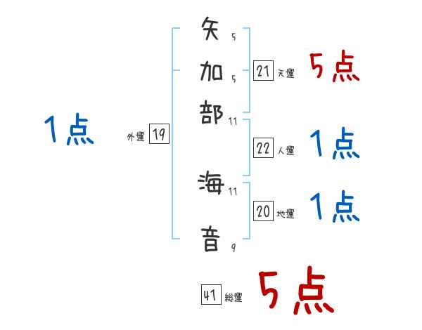外運![]() | 矢加部海音さんの外運は19画の1つ星!優れた才能を持ちますが、協調性が足りないことも。周りの人と協力する事を意識しましょう。 生活面を象徴する運勢です。外部から受ける影響力を表し、結婚運、家庭運や職場、環境への順応性を表します。 |