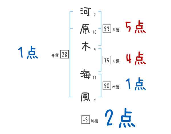 外運![]() | 河原木海風さんの外運は28画の1つ星!家庭環境に注意。スポーツで活躍できる能力があるかも。 生活面を象徴する運勢です。外部から受ける影響力を表し、結婚運、家庭運や職場、環境への順応性を表します。 |