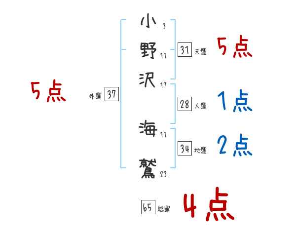 外運![]() | 小野沢海鷲さんの外運は37画の5つ星!努力家で順応性に優れる。現実的な考え方ができ忠実に物事をこなす。 生活面を象徴する運勢です。外部から受ける影響力を表し、結婚運、家庭運や職場、環境への順応性を表します。 |