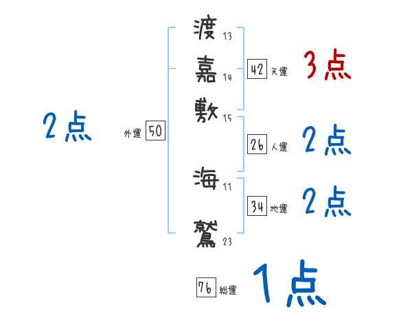 総運![]() | 渡嘉敷海鷲さんの総運は76画の1つ星!離散に注意。劣等感を感じ孤立しやすい傾向があるかも。 あなたの人生を表す1番重要な運勢です。生涯を通じて影響する総合運となり、主に50歳以降の晩年期に影響を及ぼします。 |