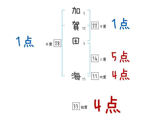 人運![]() | 加賀田海さんの人運は16画の5つ星!人望が厚く大きく発展する。逆転成功が見える。 性格や才能などを表す2番目に重要な運勢です。人間関係や協調性、社会的な成功に影響します。主に20歳から50歳ぐらいまでの中年期の運勢を表します。 |