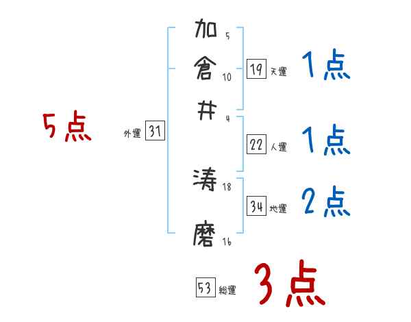 総運![]() | 加倉井涛磨さんの総運は53画の3つ星!やや見栄っ張りで虚栄心がある。散財に注意。 あなたの人生を表す1番重要な運勢です。生涯を通じて影響する総合運となり、主に50歳以降の晩年期に影響を及ぼします。 |