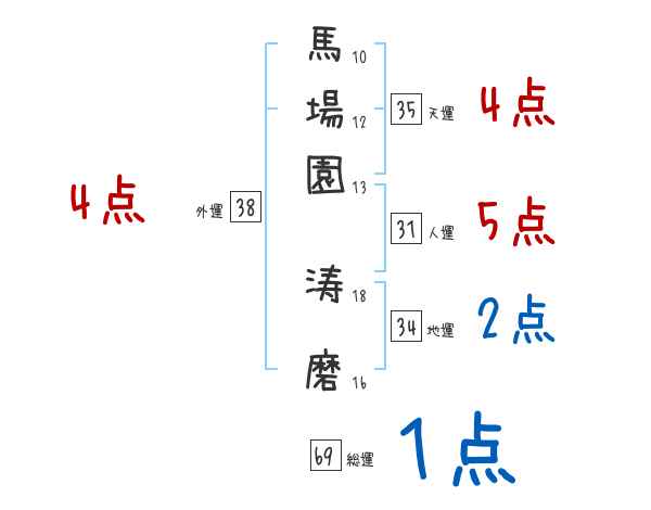 天運![]() | 馬場園涛磨さんの天運は35画の4つ星!温厚な性格で感受性が高い。穏和な性格で人望が厚い。 家系が持つ宿命的な運勢を表します。祖先から受け継いだ苗字ですので自分の力が及びません。家柄を象徴します。 |