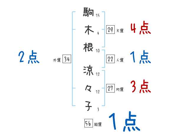 外運![]() | 駒木根涼々子さんの外運は34画の2つ星!独創性に優れるが、自尊心が強く災難に注意しましょう。 生活面を象徴する運勢です。外部から受ける影響力を表し、結婚運、家庭運や職場、環境への順応性を表します。 |