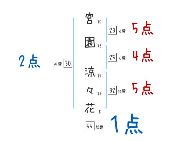 天運![]() | 宮園涼々花さんの天運は23画の5つ星!想像力に優れ活力がある。一代で成功し名誉を手に入れる。 家系が持つ宿命的な運勢を表します。祖先から受け継いだ苗字ですので自分の力が及びません。家柄を象徴します。 |