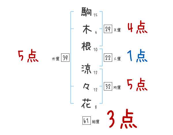 外運![]() | 駒木根涼々花さんの外運は39画の5つ星!社交性に優れ人望が厚い。人の上に立ち成功する。 生活面を象徴する運勢です。外部から受ける影響力を表し、結婚運、家庭運や職場、環境への順応性を表します。 |