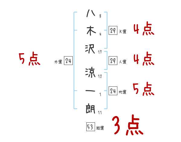 外運![]() | 八木沢涼一朗さんの外運は24画の5つ星!家庭運が良く順調な人生。金運にも恵まれる。 生活面を象徴する運勢です。外部から受ける影響力を表し、結婚運、家庭運や職場、環境への順応性を表します。 |