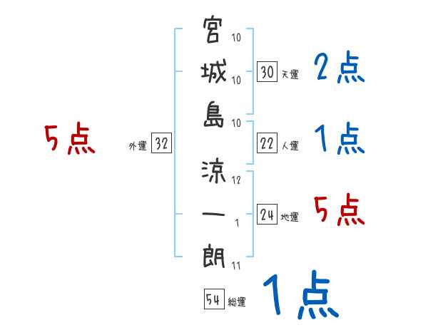 外運![]() | 宮城島涼一朗さんの外運は32画の5つ星!柔軟性があり成功する。チャンスが多く金運が良い。 生活面を象徴する運勢です。外部から受ける影響力を表し、結婚運、家庭運や職場、環境への順応性を表します。 |