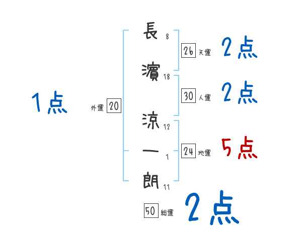 天運![]() | 長濵涼一朗さんの天運は26画の2つ星!波瀾万丈かも。信頼できる人を大事にしましょう。 家系が持つ宿命的な運勢を表します。祖先から受け継いだ苗字ですので自分の力が及びません。家柄を象徴します。 |