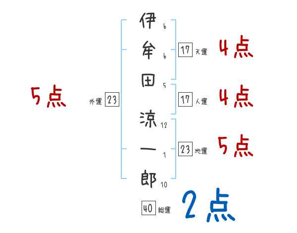 外運![]() | 伊牟田涼一郎さんの外運は23画の5つ星!想像力に優れ活力がある。一代で成功し名誉を手に入れる。 生活面を象徴する運勢です。外部から受ける影響力を表し、結婚運、家庭運や職場、環境への順応性を表します。 |
