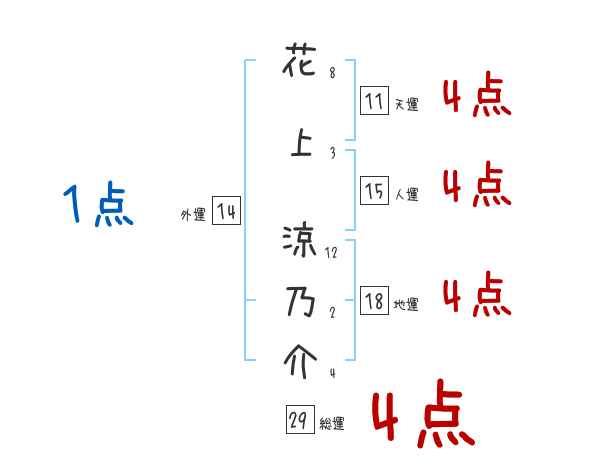 天運![]() | 花上涼乃介さんの天運は11画の4つ星!着実に富や地位を得る幸運な人生。 家系が持つ宿命的な運勢を表します。祖先から受け継いだ苗字ですので自分の力が及びません。家柄を象徴します。 |