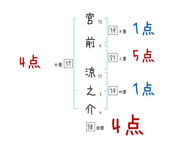 外運![]()  | 宮前涼之介さんの外運は17画の4つ星!積極的な行動力。地位を気づき財産を手に入れる。純粋な心と直感力。 生活面を象徴する運勢です。外部から受ける影響力を表し、結婚運、家庭運や職場、環境への順応性を表します。 |