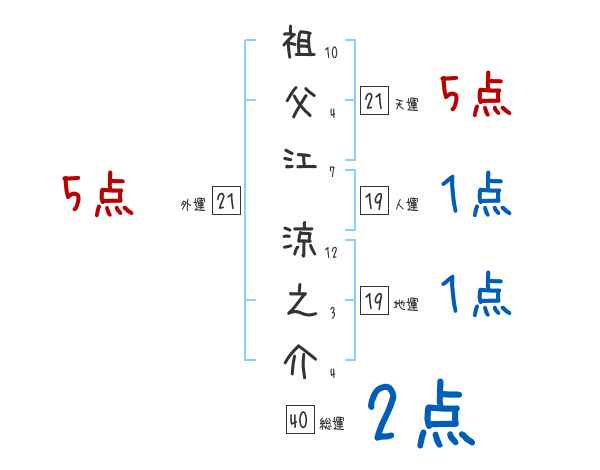 天運![]() | 祖父江涼之介さんの天運は21画の5つ星!統率力がある。独立し成功する。名誉を手に入れる。 家系が持つ宿命的な運勢を表します。祖先から受け継いだ苗字ですので自分の力が及びません。家柄を象徴します。 |