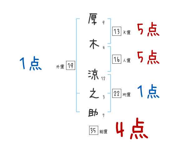 人運![]() | 厚木涼之助さんの人運は16画の5つ星!人望が厚く大きく発展する。逆転成功が見える。 性格や才能などを表す2番目に重要な運勢です。人間関係や協調性、社会的な成功に影響します。主に20歳から50歳ぐらいまでの中年期の運勢を表します。 |