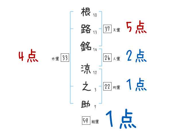 外運![]() | 根路銘涼之助さんの外運は33画の4つ星!権力志向でプライドが高い。勇気があり運を切り開き成功する。 生活面を象徴する運勢です。外部から受ける影響力を表し、結婚運、家庭運や職場、環境への順応性を表します。 |