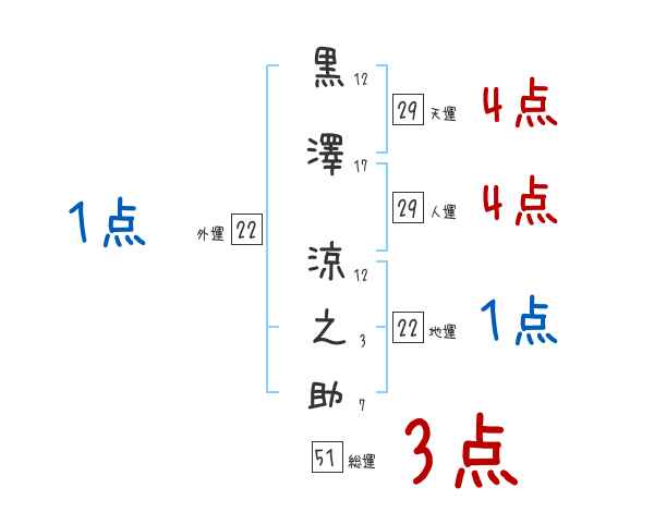 外運![]() | 黒澤涼之助さんの外運は22画の1つ星!努力することが苦手ないっぽう手先が器用。芸術性にも優れる。 生活面を象徴する運勢です。外部から受ける影響力を表し、結婚運、家庭運や職場、環境への順応性を表します。 |