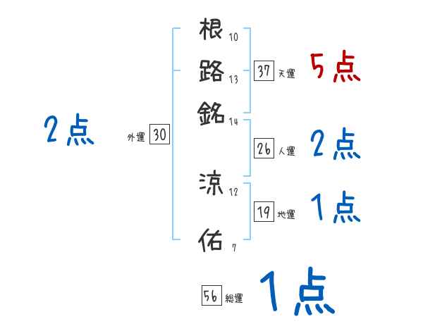 外運![]() | 根路銘涼佑さんの外運は30画の2つ星!浮き沈みの激しさに注意しましょう。 生活面を象徴する運勢です。外部から受ける影響力を表し、結婚運、家庭運や職場、環境への順応性を表します。 |