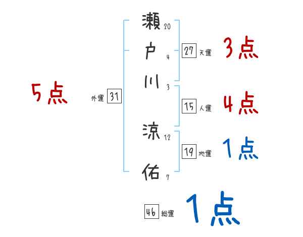 総運![]() | 瀬戸川涼佑さんの総運は46画の1つ星!迷走することが多く苦労するかも。目先のことにとらわれないように。 あなたの人生を表す1番重要な運勢です。生涯を通じて影響する総合運となり、主に50歳以降の晩年期に影響を及ぼします。 |