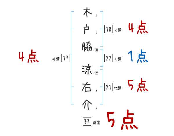 外運![]() | 木戸脇涼右介さんの外運は17画の4つ星!積極的な行動力。地位を気づき財産を手に入れる。純粋な心と直感力。 生活面を象徴する運勢です。外部から受ける影響力を表し、結婚運、家庭運や職場、環境への順応性を表します。 |