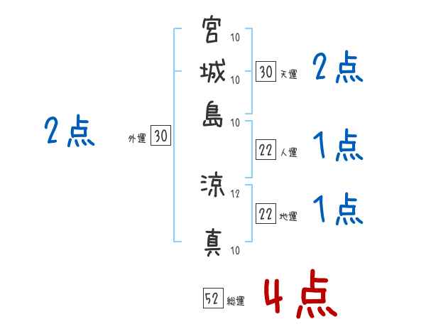 天運![]() | 宮城島涼真さんの天運は30画の2つ星!浮き沈みの激しさに注意しましょう。 家系が持つ宿命的な運勢を表します。祖先から受け継いだ苗字ですので自分の力が及びません。家柄を象徴します。 |