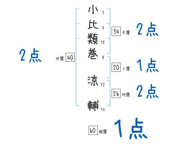 外運![]() | 小比類巻涼輔さんの外運は40画の2つ星!自信過剰で物事に固執するためトラブルに注意。 生活面を象徴する運勢です。外部から受ける影響力を表し、結婚運、家庭運や職場、環境への順応性を表します。 |