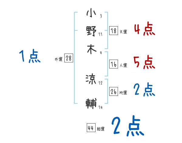 天運![]() | 小野木涼輔さんの天運は18画の4つ星!情熱的で剛気。忍耐力があり信頼される。 家系が持つ宿命的な運勢を表します。祖先から受け継いだ苗字ですので自分の力が及びません。家柄を象徴します。 |