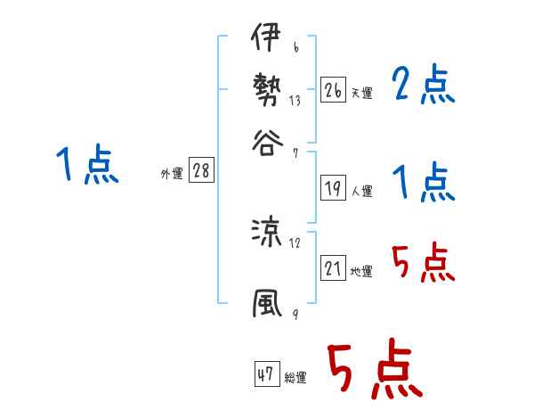 天運![]() | 伊勢谷涼風さんの天運は26画の2つ星!波瀾万丈かも。信頼できる人を大事にしましょう。 家系が持つ宿命的な運勢を表します。祖先から受け継いだ苗字ですので自分の力が及びません。家柄を象徴します。 |