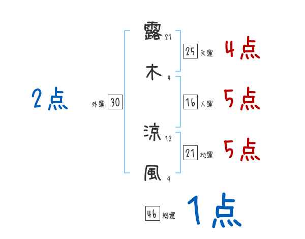 地運![]() | 露木涼風さんの地運は21画の5つ星!統率力がある。独立し成功する。名誉を手に入れる。 個性を表す基礎的な運勢です。性格形成や対人関係、行動力など家庭環境に影響されます。主に誕生してから20歳くらいまでの若年期の運勢を表します。 |