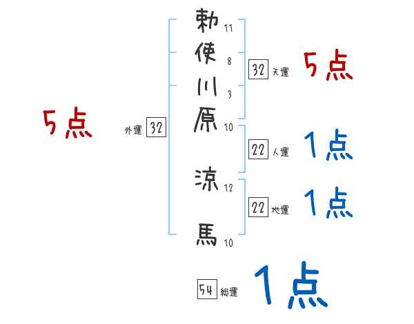 外運![]() | 勅使川原涼馬さんの外運は32画の5つ星!柔軟性があり成功する。チャンスが多く金運が良い。 生活面を象徴する運勢です。外部から受ける影響力を表し、結婚運、家庭運や職場、環境への順応性を表します。 |