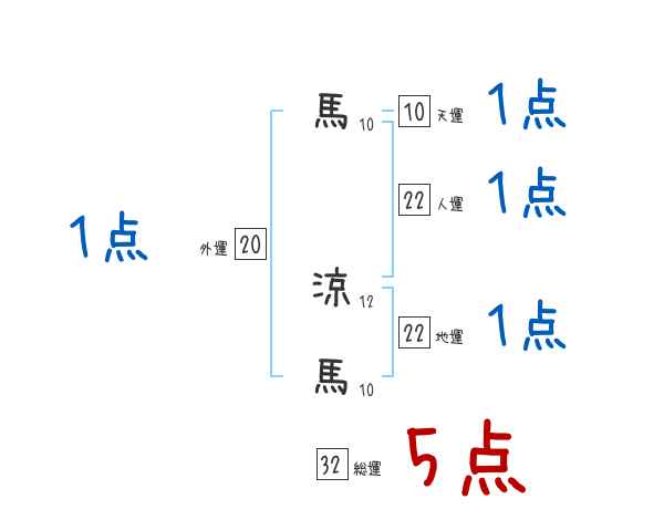 天運![]() | 馬涼馬さんの天運は10画の1つ星!不安を感じやすい傾向。ストレスを抱えないように注意しましょう。 家系が持つ宿命的な運勢を表します。祖先から受け継いだ苗字ですので自分の力が及びません。家柄を象徴します。 |