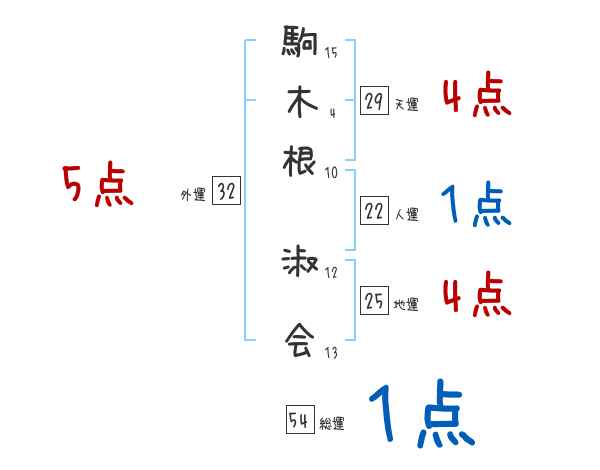外運![]() | 駒木根淑会さんの外運は32画の5つ星!柔軟性があり成功する。チャンスが多く金運が良い。 生活面を象徴する運勢です。外部から受ける影響力を表し、結婚運、家庭運や職場、環境への順応性を表します。 |