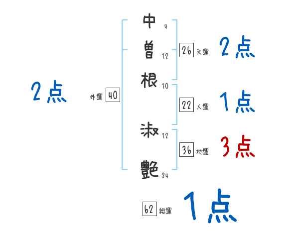 天運![]() | 中曽根淑艶さんの天運は26画の2つ星!波瀾万丈かも。信頼できる人を大事にしましょう。 家系が持つ宿命的な運勢を表します。祖先から受け継いだ苗字ですので自分の力が及びません。家柄を象徴します。 |